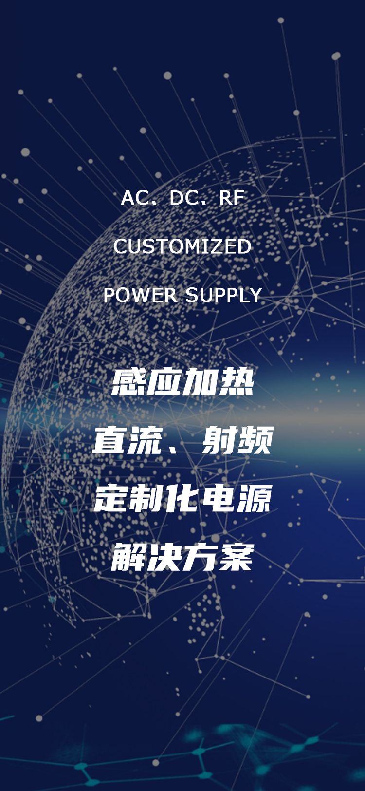主要產品有全自動智能化低頻/中頻/超音頻/高頻/超高頻感應加熱電源、并聯斬波電源、空冷電源、直流電源、射頻電源、定制化電源等。